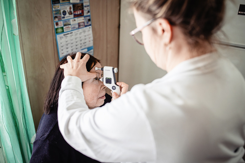 Mari Huhtanen tar fram ögontrycksmätaren och konstaterar att trycket är för högt. Hon planerar att ringa till Sunderby sjukhus när hon är tillbaka på hälsocentralen.