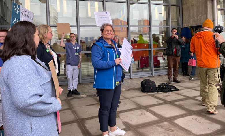 Moa Gustavsson, specialistsjuksköterska inom barn- och ungdomsvård, fanns också på plats vid huvudentrén. Hon arbetar på barnakuten och är förtroendevald för Vårdförbundet.