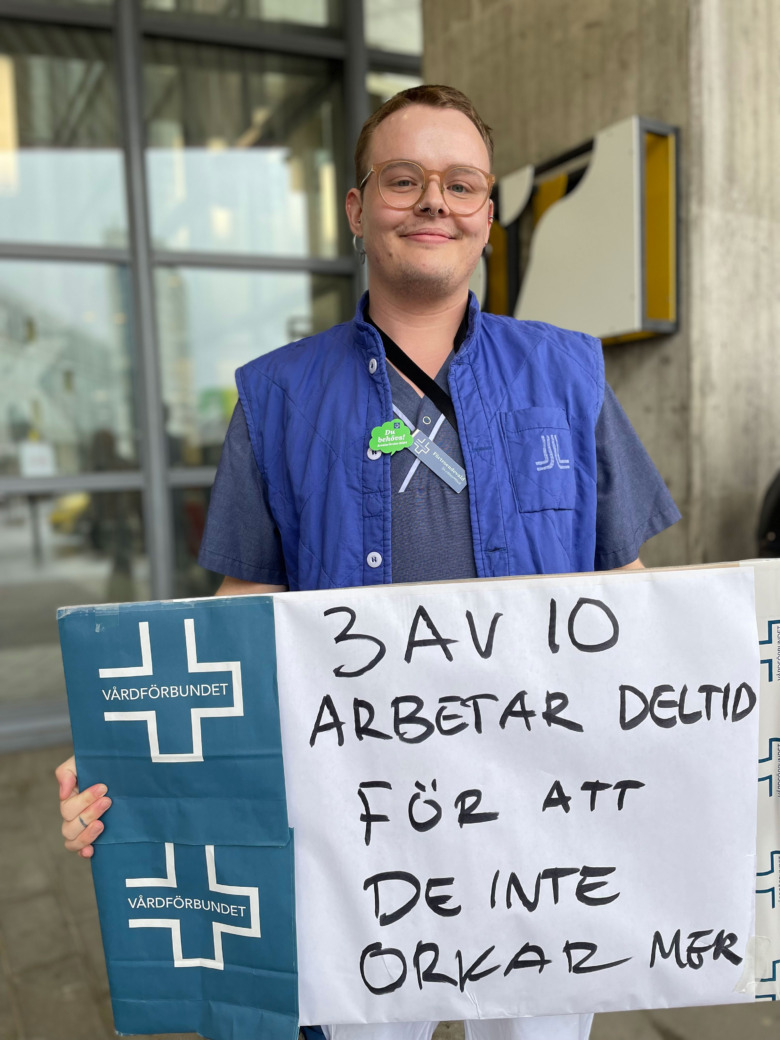 En av medlemmarna som fanns på plats utanför Karolinska i Huddinge med plakat var Hannes Vikberg, sjuksköterska och förtroendevald, som jobbar på infektionsmottagning 2 och 3.