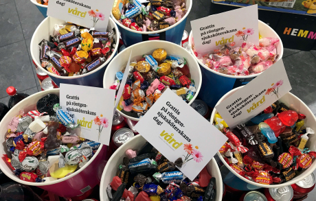 Men eftersom man på Vårdförbundets avdelning i Skåne beslutat att fira alla yrkesgrupper på en och samma dag, nämligen i maj i samband med sjuksköterskedagen, bestämde vi på Vårdfokus oss för att bjuda röntgensjusköterskorna i Malmö på lite godis.